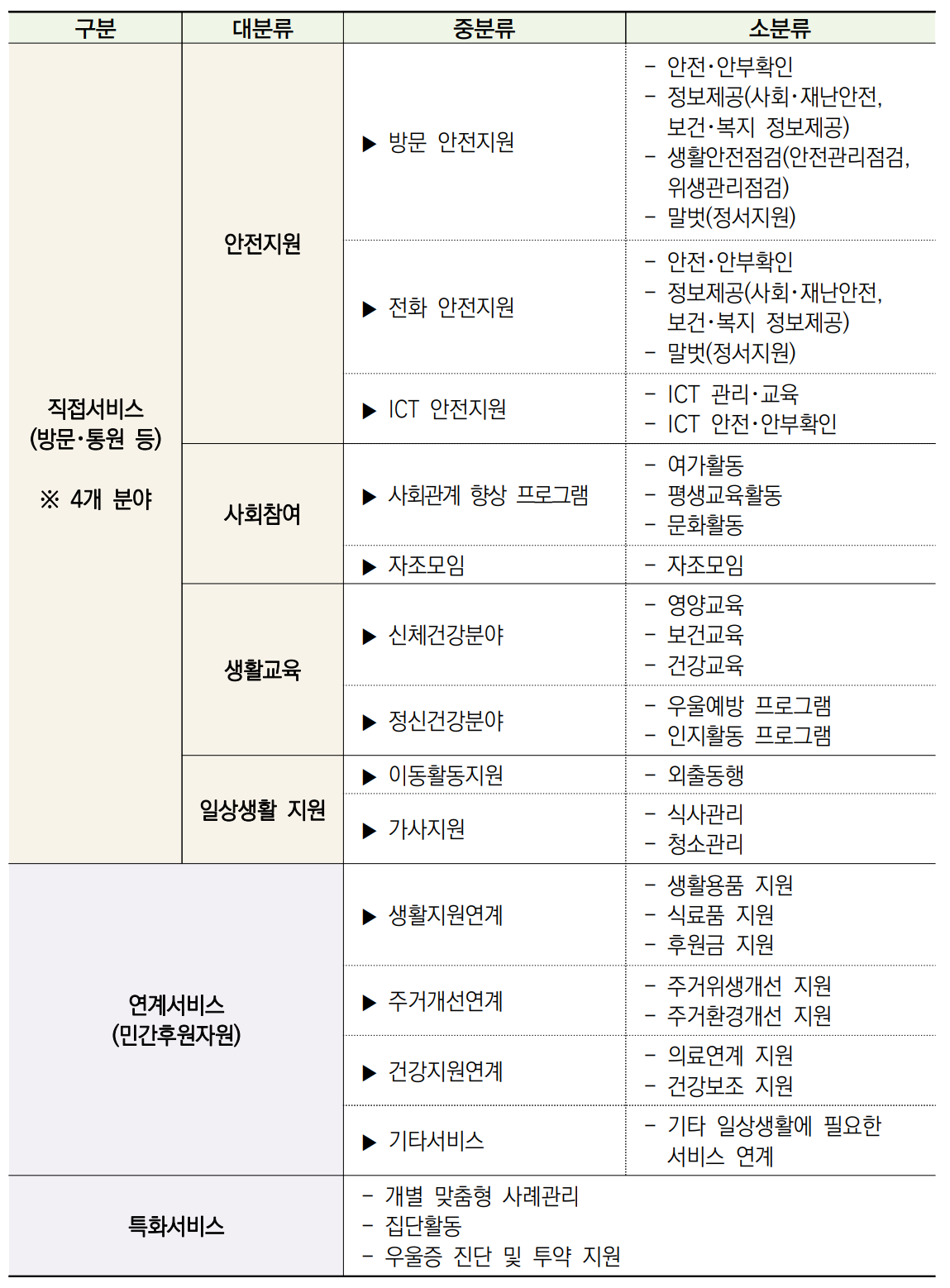 | 중점돌봄군 | 사회적 관계 단절 및 일생생활의 어려움으로 돌봄이 필요한 분 월 16시간 미만 직접서비스 + 연계서비스(필요시) + 특화서비스(필요시) |