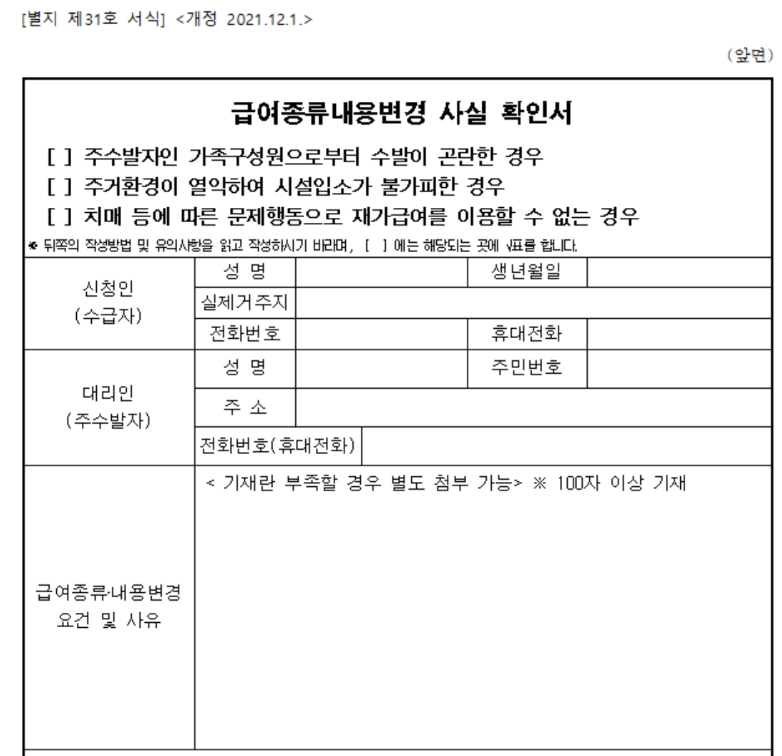 등급 변경이 필요한 사유에 대해서도 기재를 하는 급여종류내용변경 사실신청서 서식도 제출해야 한다.