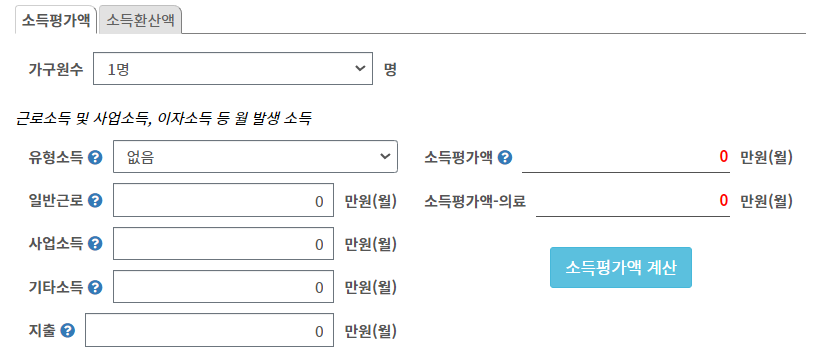 엔젤시터 기초생활 모의계산기는 소득평가액과 소득환산액을 나눠서 분리해서 계산해 볼 수 있다.