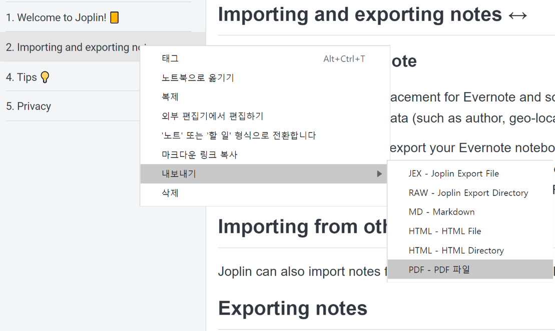 내보내기 메뉴를 통해 PDF, HTML 등 다양한 포멧으로 전환 후 외부와 공유할 수 있다.