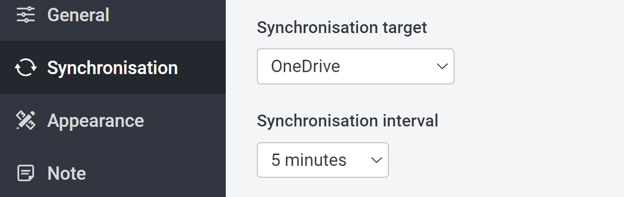 Synchronisation 메뉴를 통해서 데이터 싱크 위치를 설정할 수 있다.