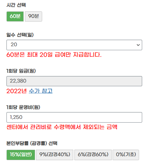 60분, 90분을 1일 시급형으로 제공하는 곳도 있고, 센터운영비를 제외하는 경우도 있다.