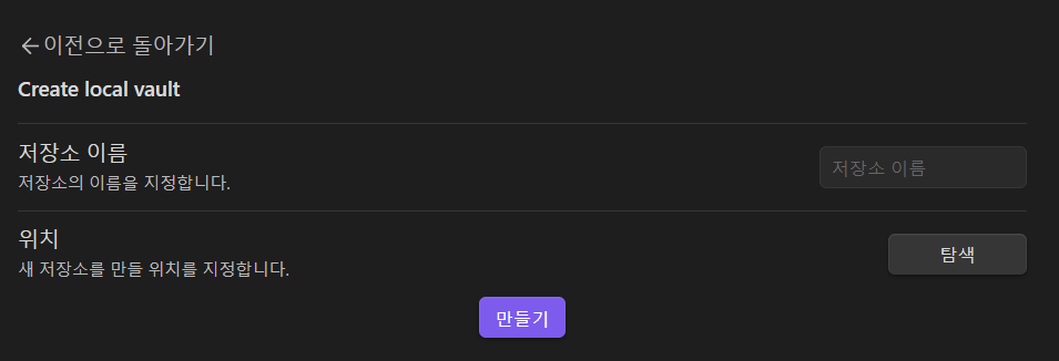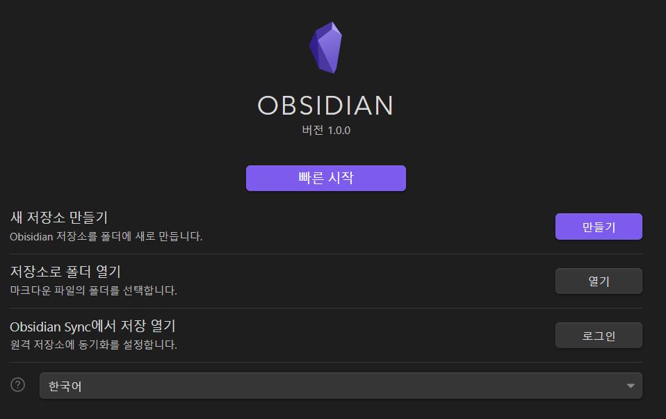 Obsidain를 사용하기 위해서는 최초 한 번은 새 저장소 만들기를 해야 한다.