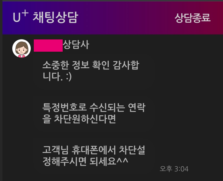 통신사에 직접 차단해 주는 것으로 알고 있다고 하니깐 잠시 기다리고 하더니 별도의 연락처를 알려주었다.