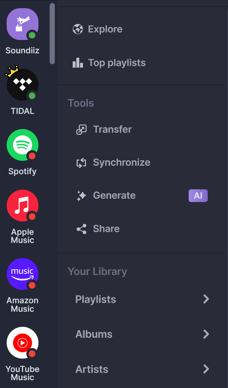 위 화면서 Tools->Transfer를 눌러 타이달 계정에 있는 음악목록을 soundiiz로 옮긴다.