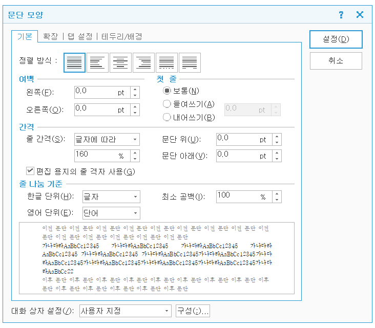 문단 조정도 역시 대화 상자를 열어야 한다.