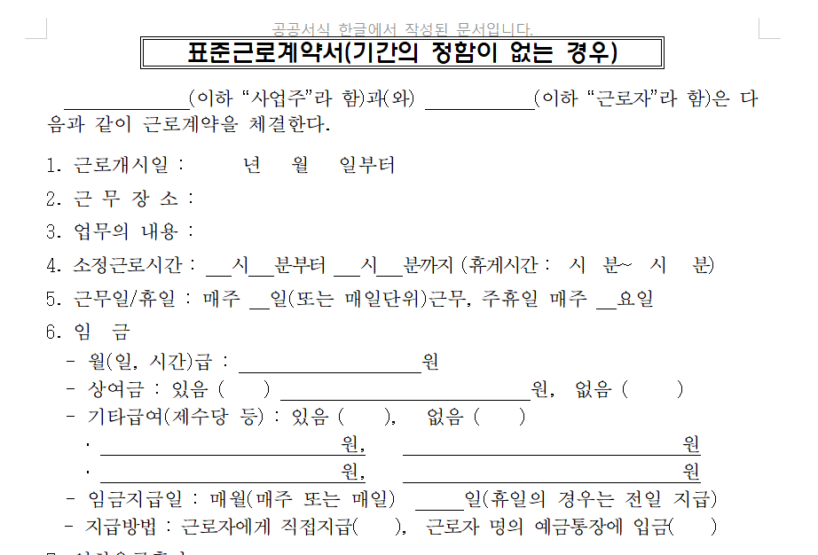 공공서식 한글 문서는 "공공서식 한글에서 작성된 문서입니다"라는 메시지가 상단에 뜬다.