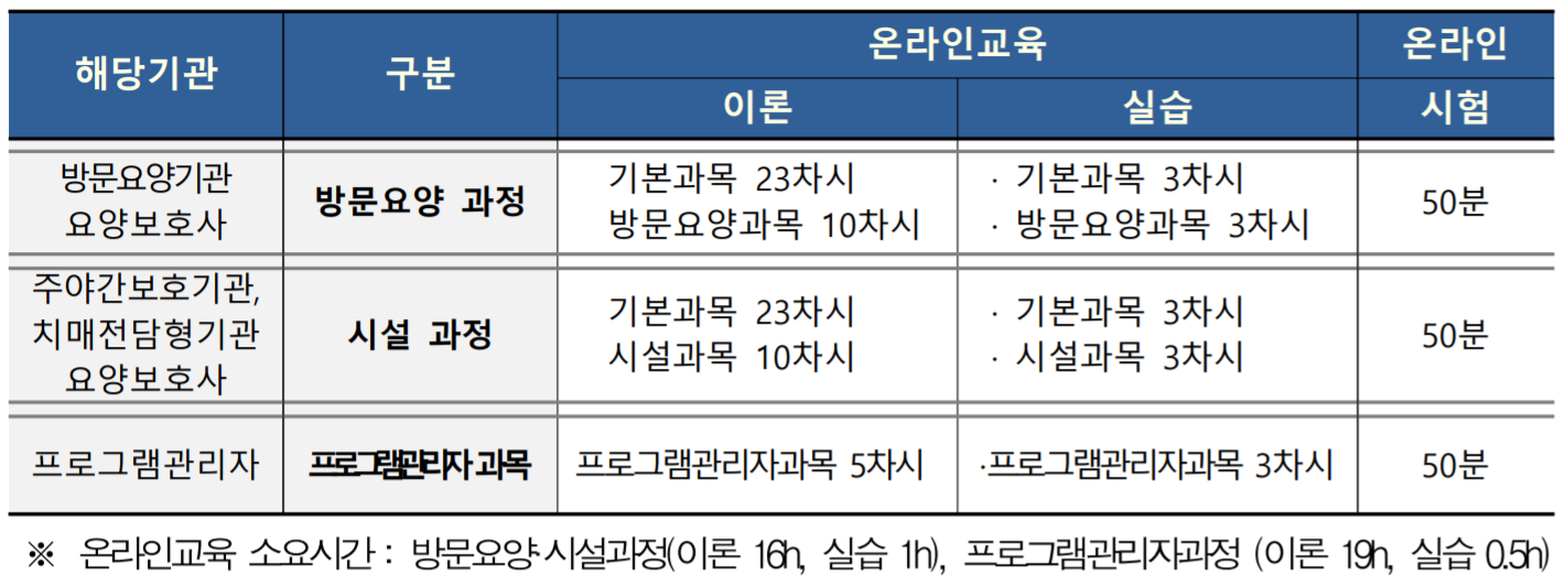 방문요양과정 또는 시설과정 수료자가 다른 과정 신청 시 기본과목은 자동 제외된다. 방문요양기관 종사자는 시설 과정 신청 불가하며, 주야간보호기관, 치매전담형기관 종사자는 방문요양과정 신청 불가하다.