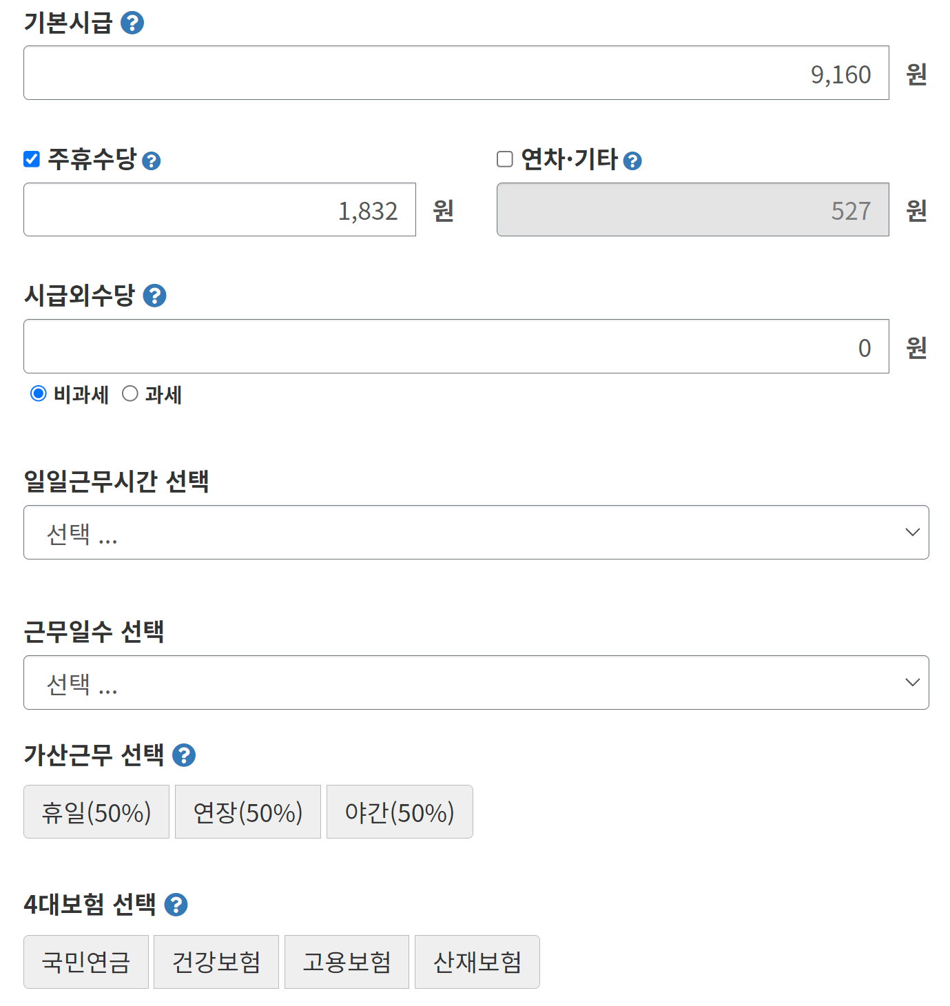 공휴일 근무 및 4대 보험까지 하면 직접 계산이 복잡할 수 있다. 모의계산기를 이용하면 좀 더 수월하게 계산해 볼 수 있다.