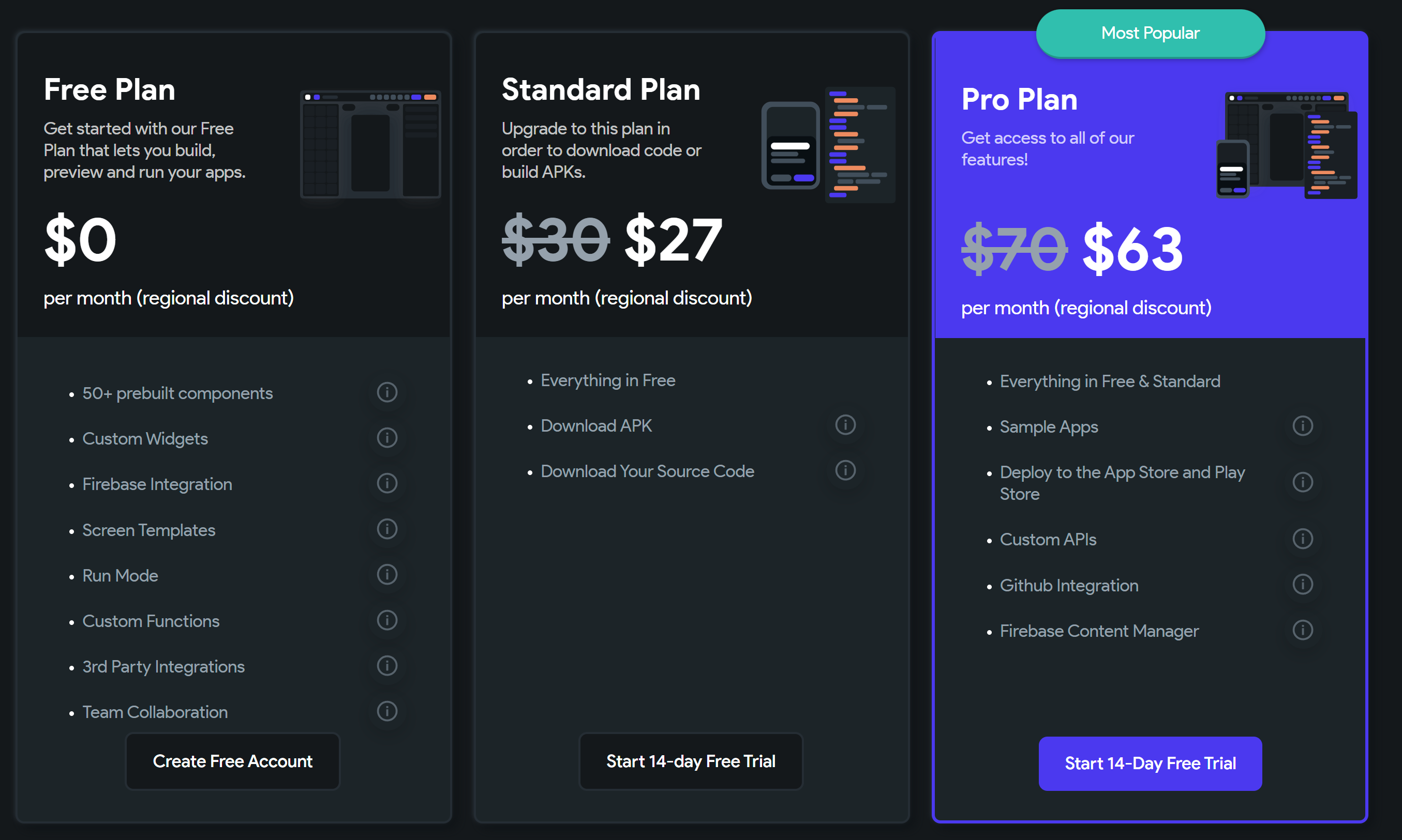 무료플랜, 유료 플랜으로 스탠더드와 프로 플랜이 있다. 플러터플로우는 가입 후 무료로 사용할 수 있지만 작성한 앱을 빌드하거나 코드보기는 유료 회원만 가능하다. 계속 사용할 것 같아서 유료로 결제를 했다.