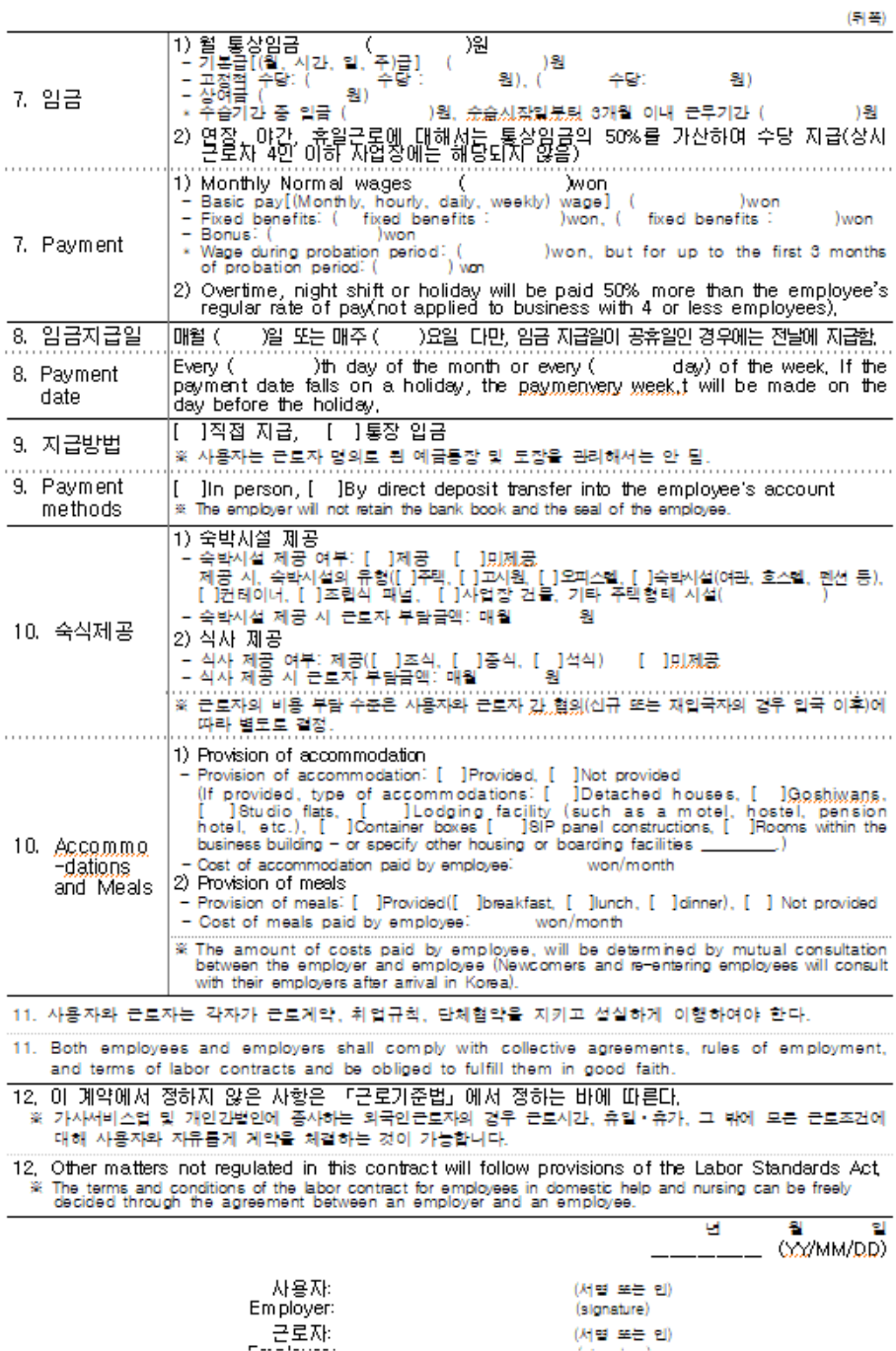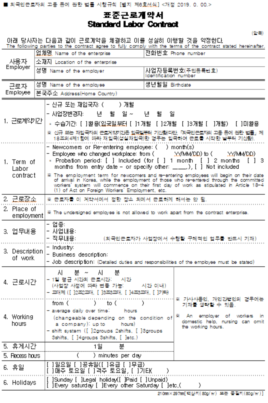 ⦁ 표준근로계약서 Standard Labor Contract ( 외국인용 )