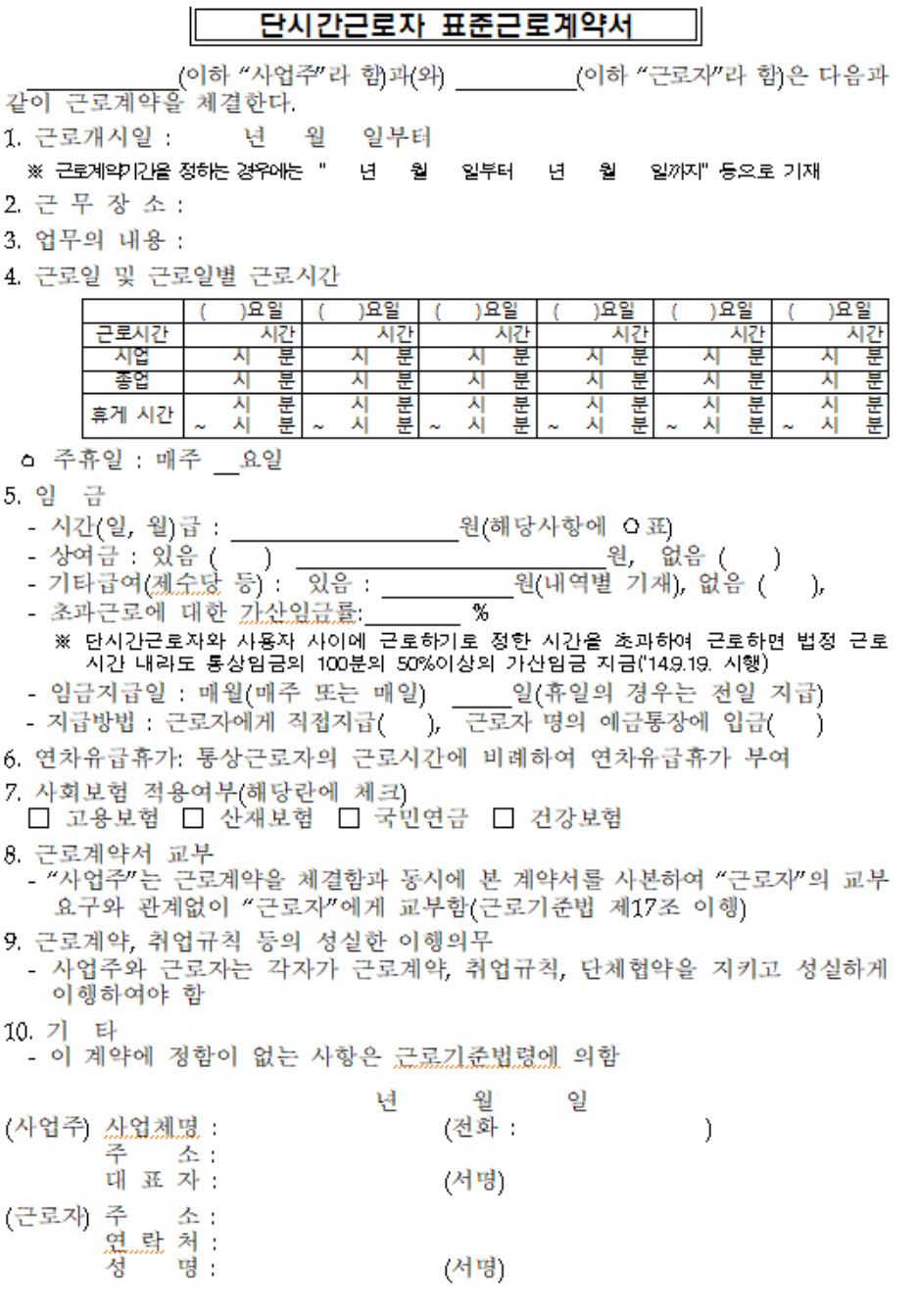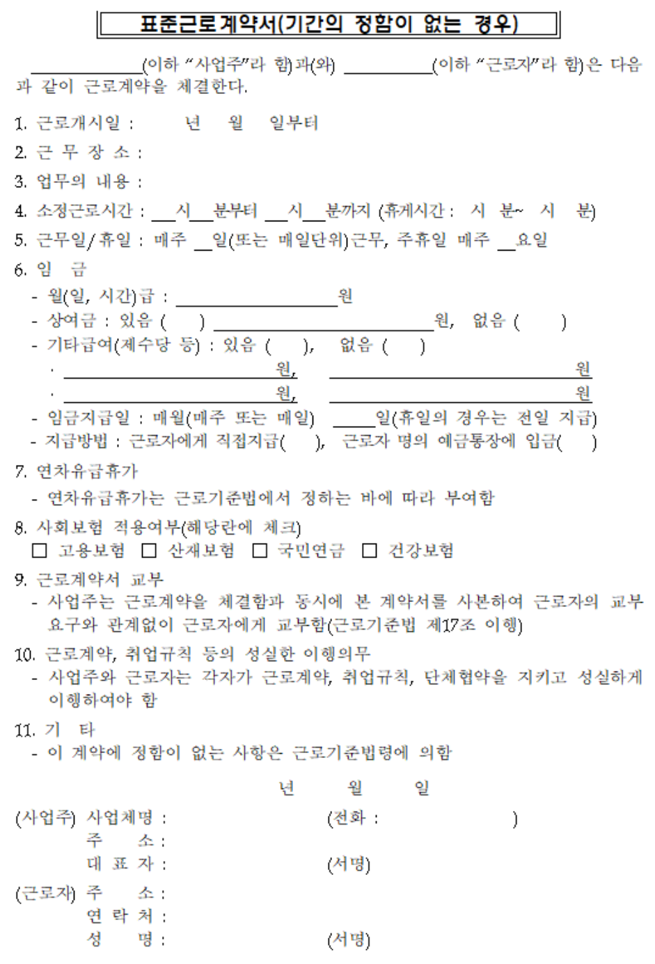 근로계약서에는 임금, 근로시간, 휴일, 연차, 유급휴가 임금에 대한 내용과 업무와 근무장소 등 근로계약에 꼭 필요한 사항이 기재되어 있어야 하기 때문에 표준근로계약서를 이용하는 것이 좋다.