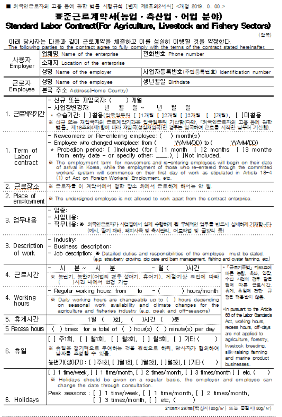 ⦁표준근로계약서(농업ㆍ축산업ㆍ어업 분야) ( 외국인용 )Standard Labor Contract(For Agriculture, Livestock and Fishery Sectors)