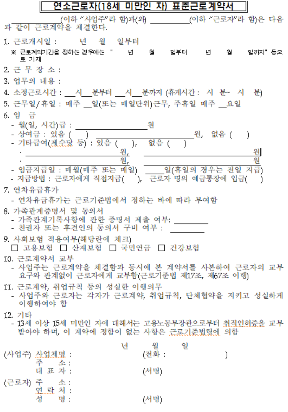 ⦁ 연소근로자(18세 미만인 자) 표준근로계약