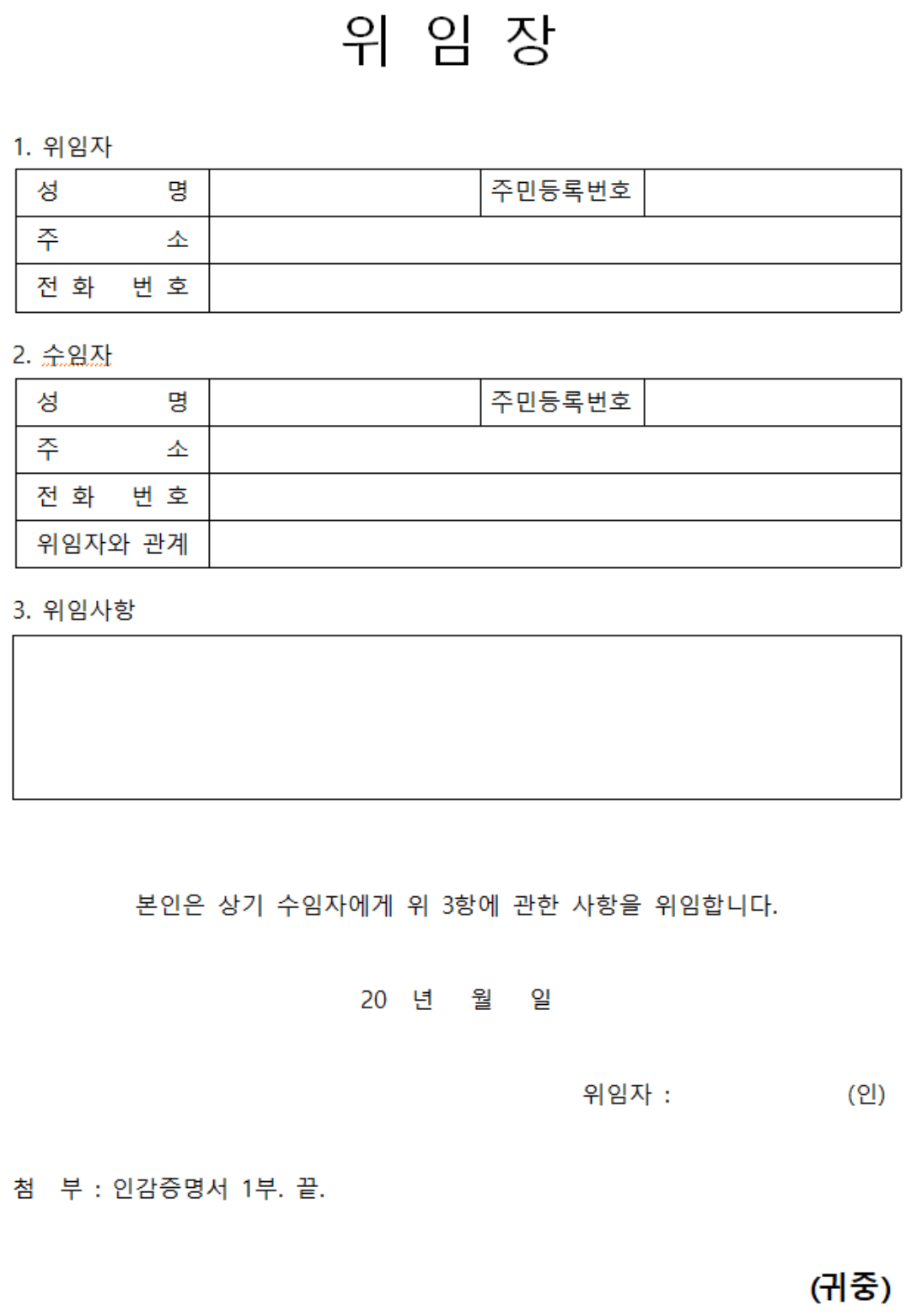 대리로 업무를 수행할 때 꼭 필요한 문서가 위임장 양식이다. 위임장 6종의 한글 hwp 파일을 즉시 다운로드해 이용할 수 있다. 각각의 위임장 이미지 바로 밑에 첨부파일이 있다. hwp파일이므로 한글워드 또는 뷰어를 통해서 실행이 가능하다.